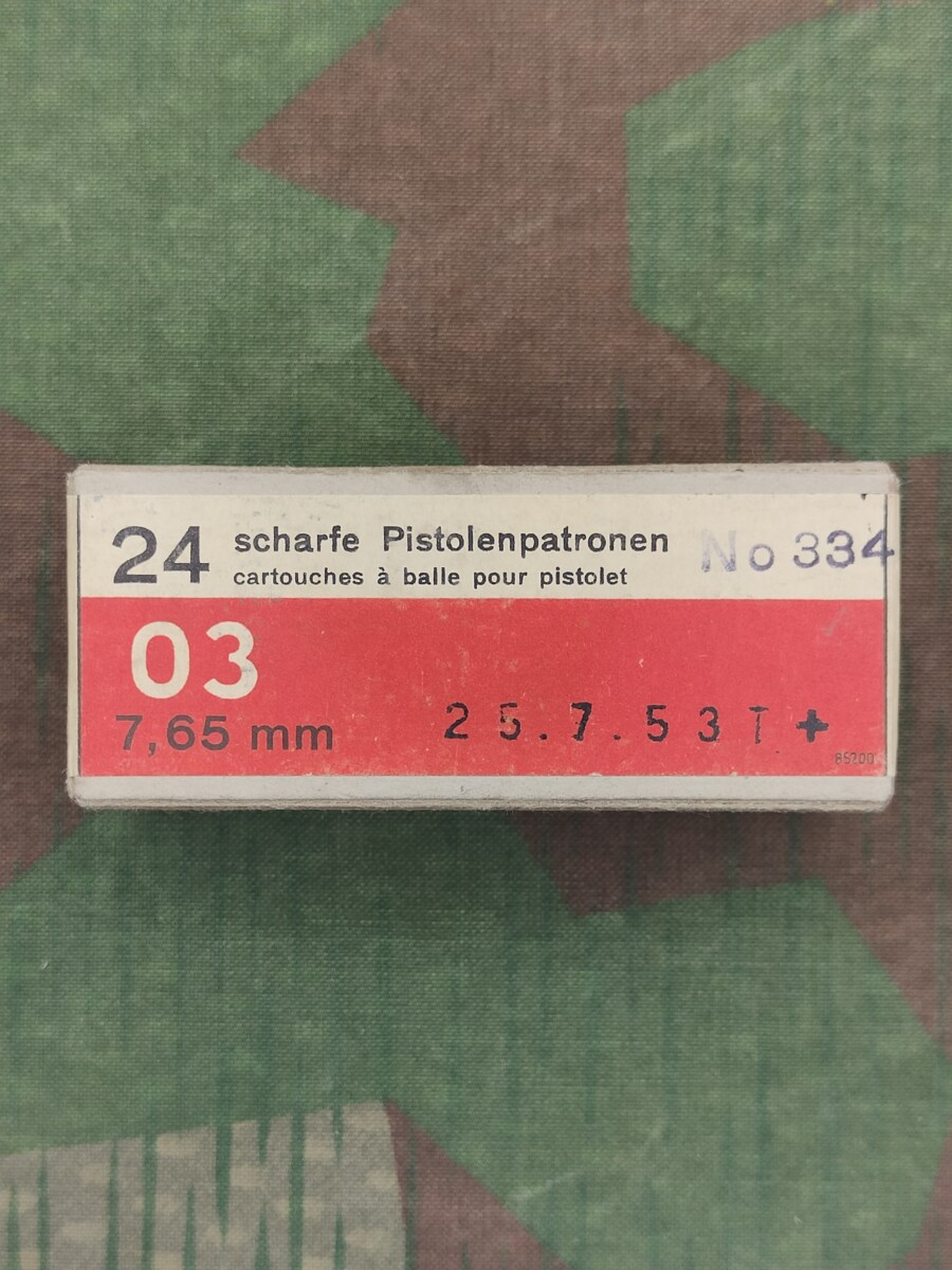 Aufschrift: 24 scharfe Pistolenpatronen 03 7,65 mm