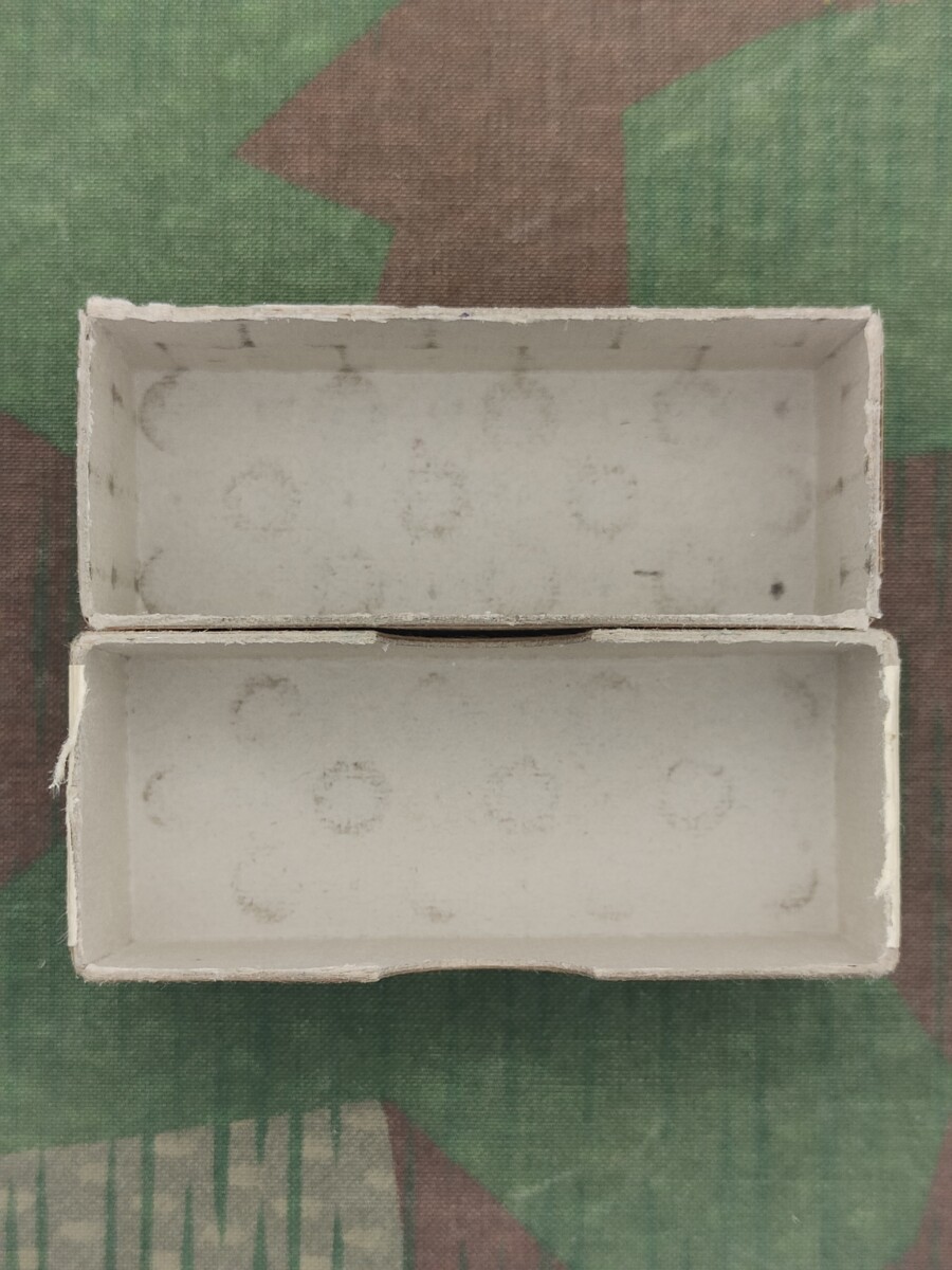 Die Munitionsschachtel ist leer und hat eine 2-sprachige Aufschrift.