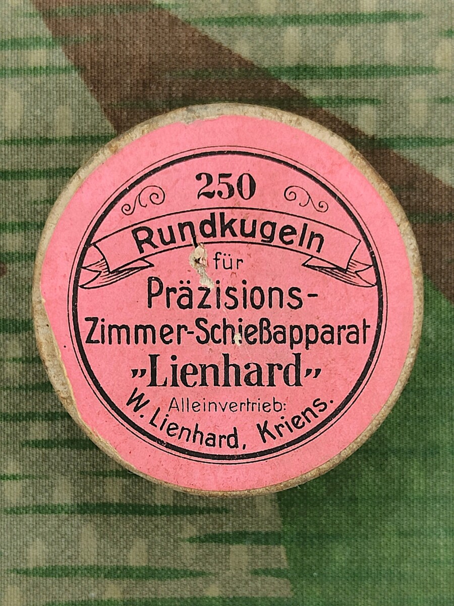 Aufschrift: 250 Rundkugeln für Präzisions-Zimmer-Schießapparat “Lienhard”